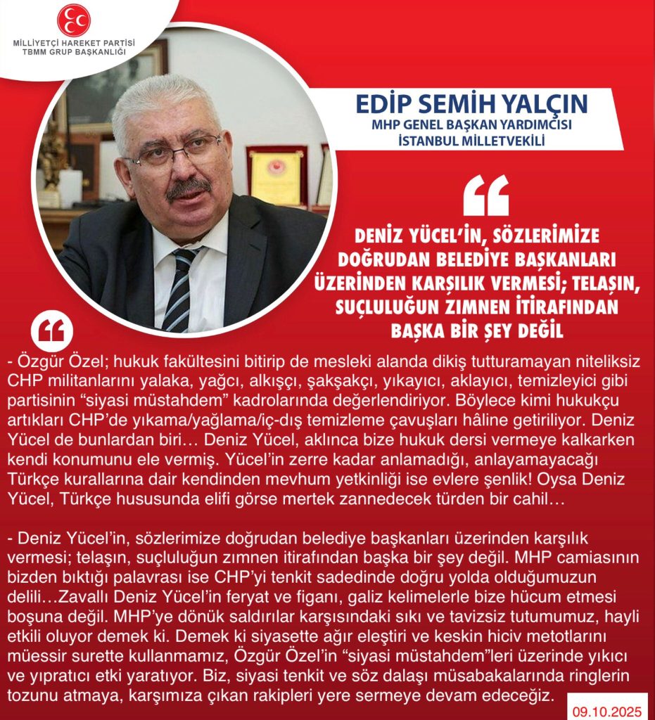 MHP Genel Başkan Yardımcısı ve İstanbul Milletvekilimiz Prof. Dr. E. Semih Yalçın : Deniz Yücel’in, sözlerimize doğrudan belediye başkanları üzerinden karşılık vermesi; telaşın, suçluluğun zımnen itirafından başka bir şey değil