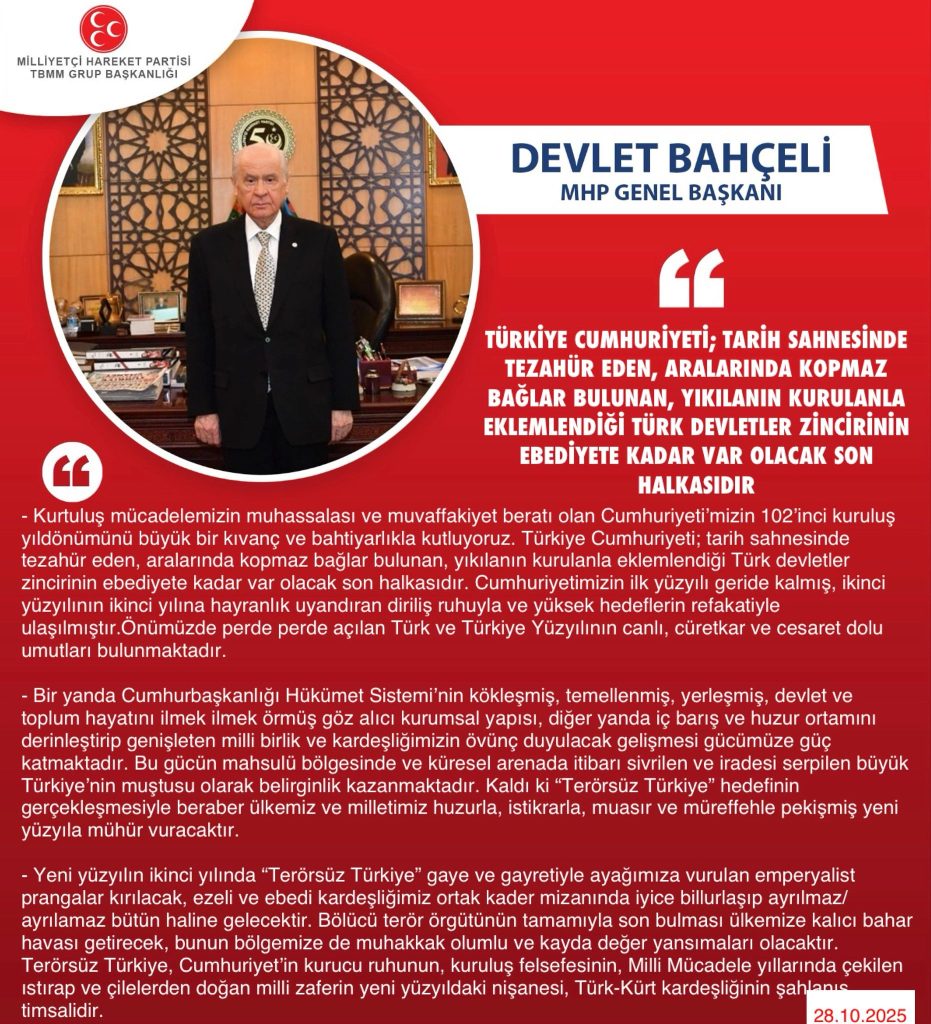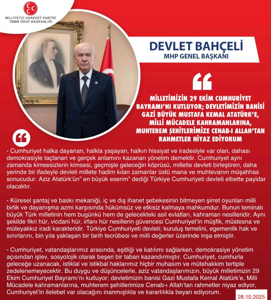 Genel Başkanımız Sayın Devlet BAHÇELİ’nin, “29 Ekim Cumhuriyet Bayramı” mesajı