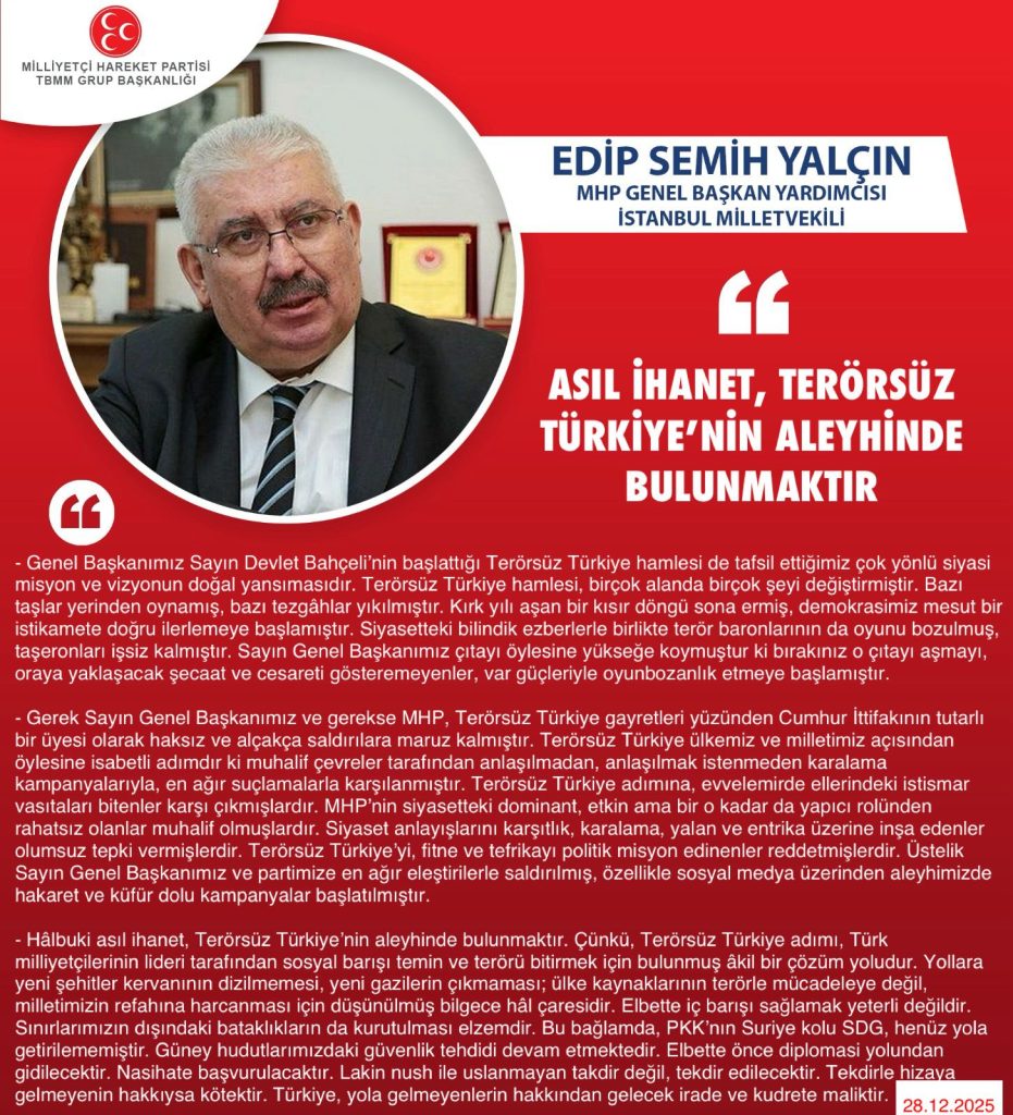 Gerek Sayın Genel Başkanımız ve gerekse MHP, Terörsüz Türkiye gayretleri yüzünden Cumhur İttifakının tutarlı bir üyesi olarak haksız ve alçakça saldırılara maruz kalmıştır.