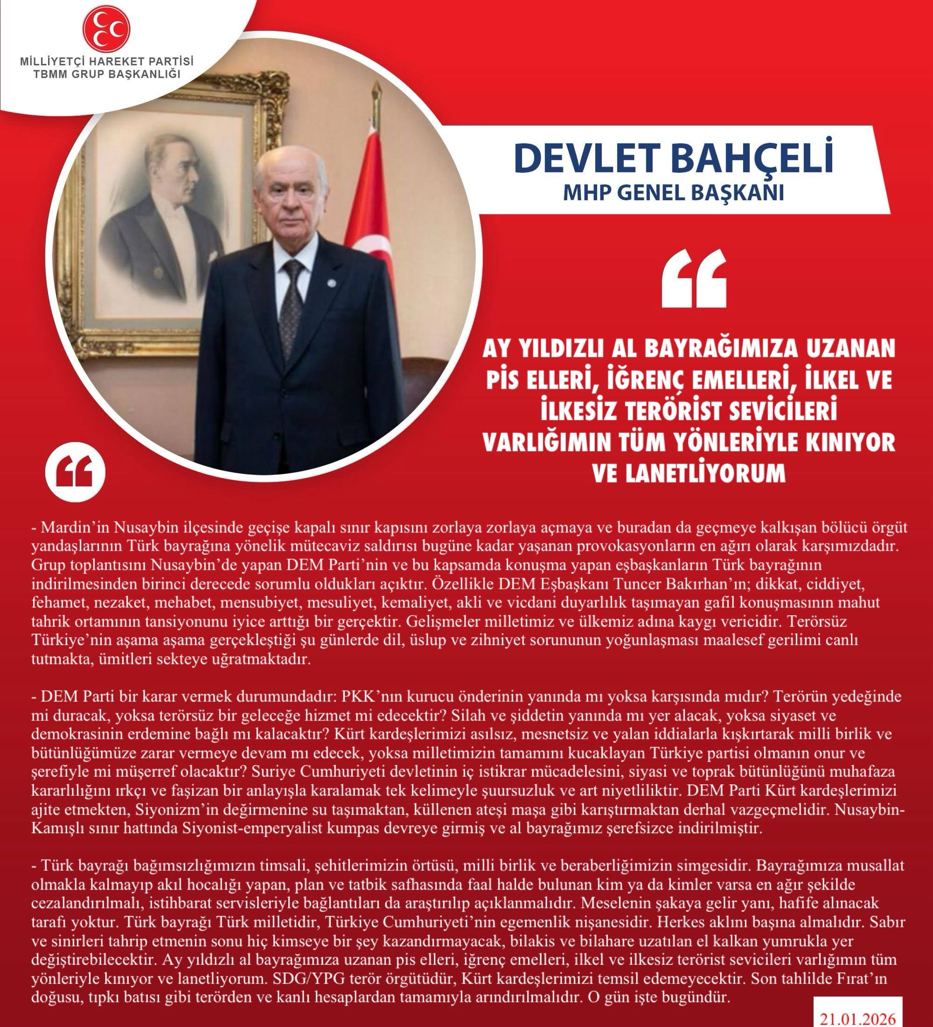 Grup toplantısını Nusaybin’de yapan DEM Parti’nin ve bu kapsamda konuşma yapan eşbaşkanların Türk bayrağının indirilmesinden birinci derecede sorumlu oldukları açıktır.