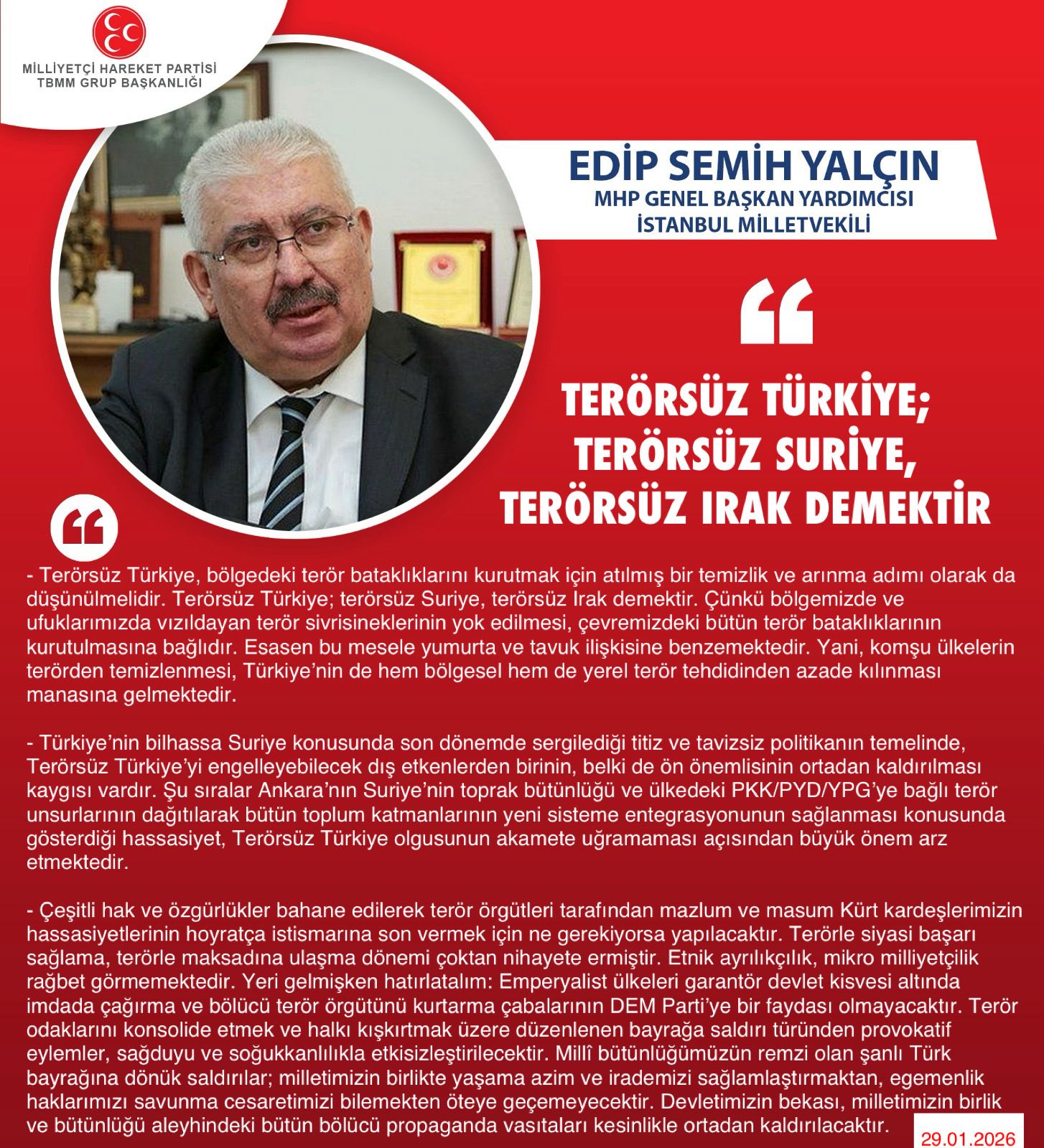 MHP Genel Başkan Yardımcısı ve İstanbul Milletvekilimiz Prof. Dr. E. Semih Yalçın: Terörsüz Türkiye; terörsüz Suriye, terörsüz Irak demektir.