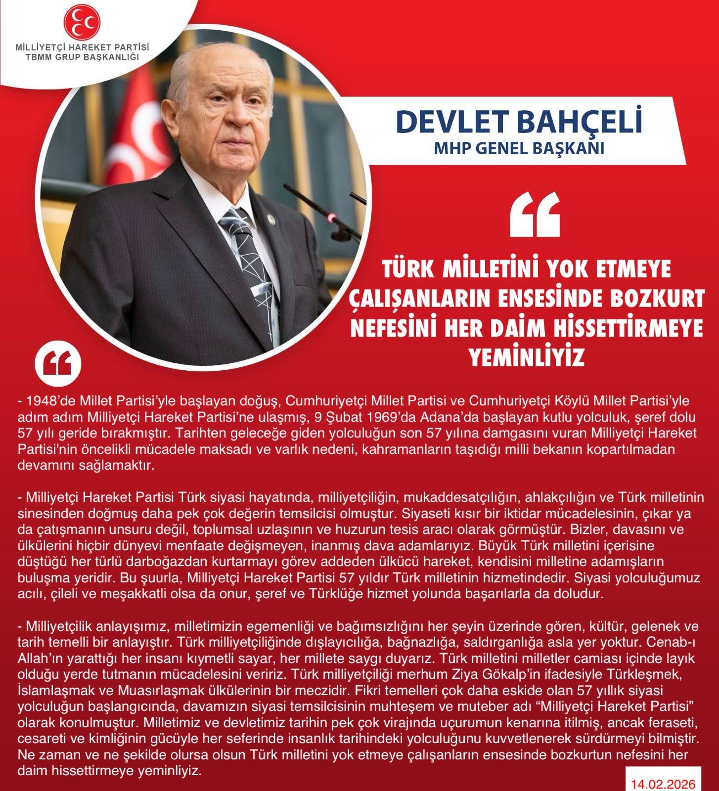 Bu şuurla, Milliyetçi Hareket Partisi 57 yıldır Türk milletinin hizmetindedir. Siyasi yolculuğumuz acılı, çileli ve meşakkatli olsa da onur, şeref ve Türklüğe hizmet yolunda başarılarla da doludur.