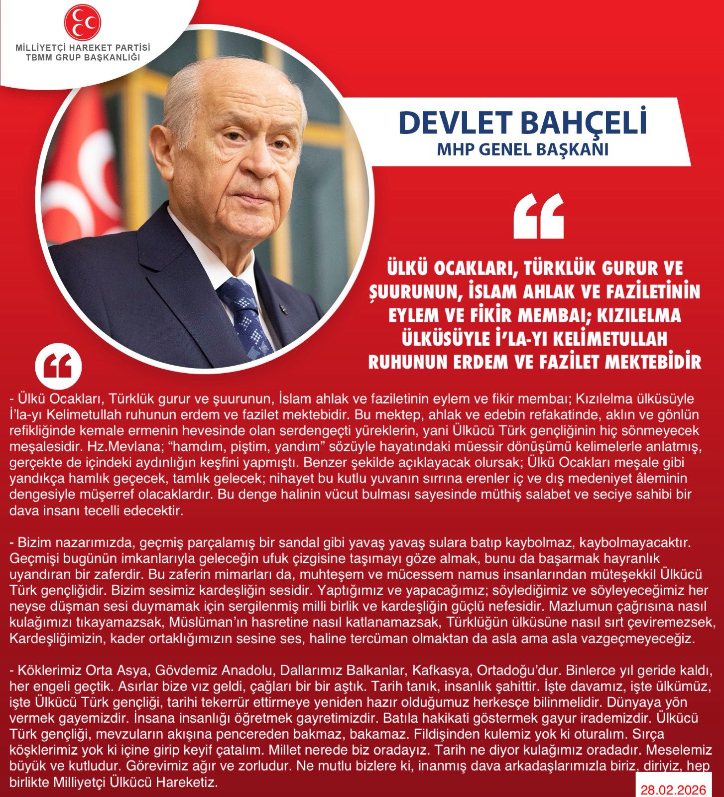 Ülkü Ocakları, Türklük gurur ve şuurunun, İslam ahlak ve faziletinin eylem ve fikir membaı; Kızılelma ülküsüyle İ’la-yı Kelimetullah ruhunun erdem ve fazilet mektebidir.